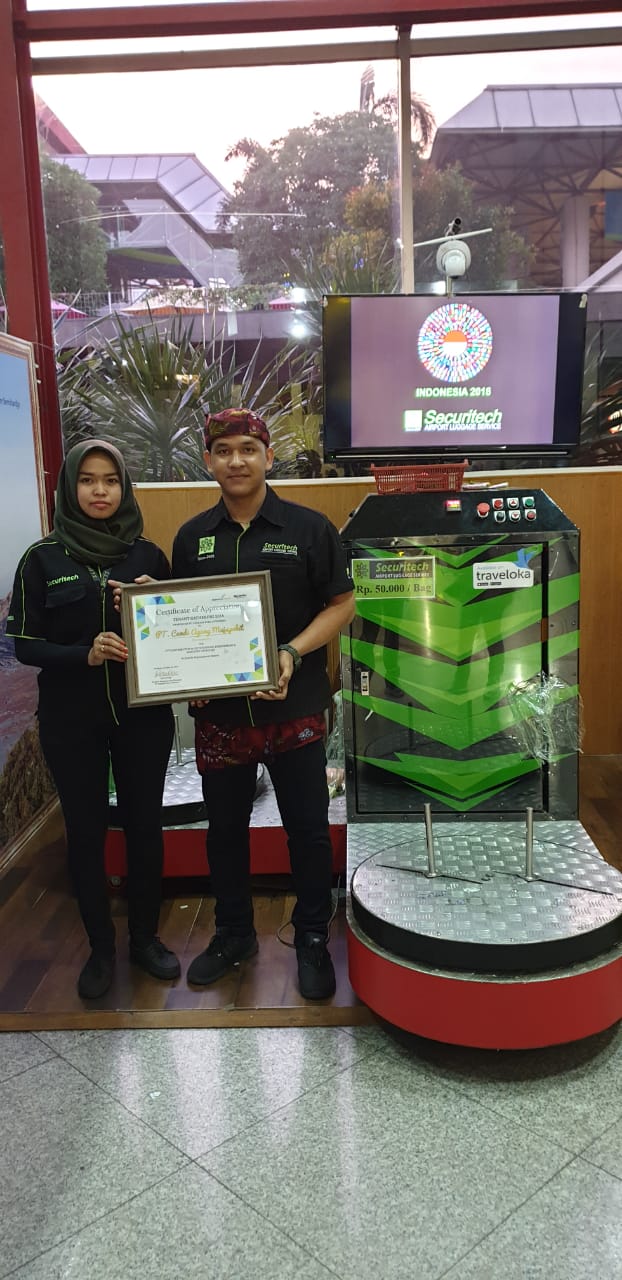 LAYANAN TERBAIK: Petugas wrapping Securitech Indonesia memegang menerima penghargaan 3rd Contributor & Outstanding Performance Services Category dari PT Angkasa Pura I.