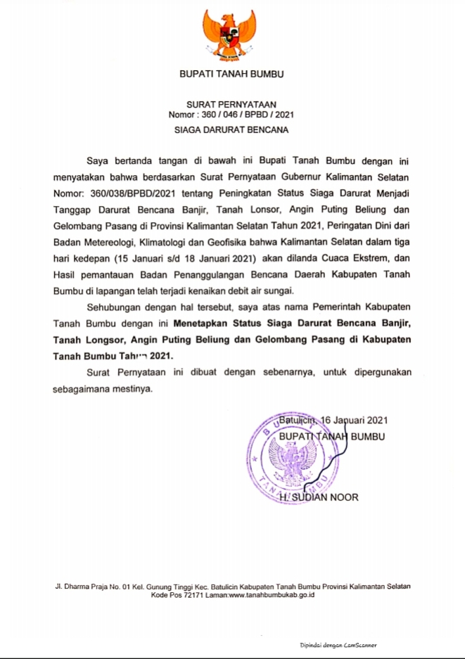 Penerbitan surat Bupati terkait Siaga darurat bencana tersebut,  menyusul naiknya status Provinsi Kalimantan Selatan dari Siaga Darurat Bencana menjadi Tanggap Darurat Bencana, sesuai surat Gubernur Sahbirin Noor nomor : 360/038/BPBD/2021.