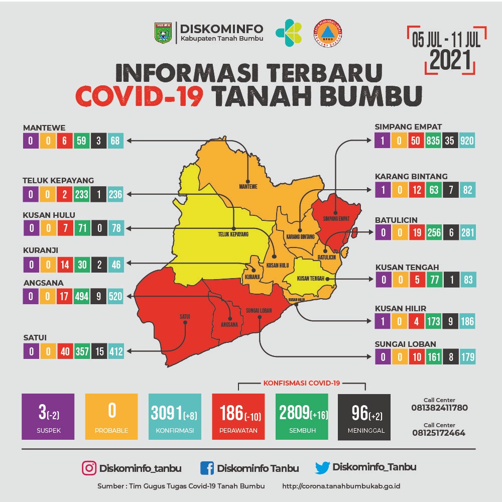 BATULICIN,headline9.com – Data Update terakhir perkembangan kasus konfirmasi Covid 19 di Kabupaten Tanah Bumbu per jam 16.00 Wita, Rabu 07/07/21.