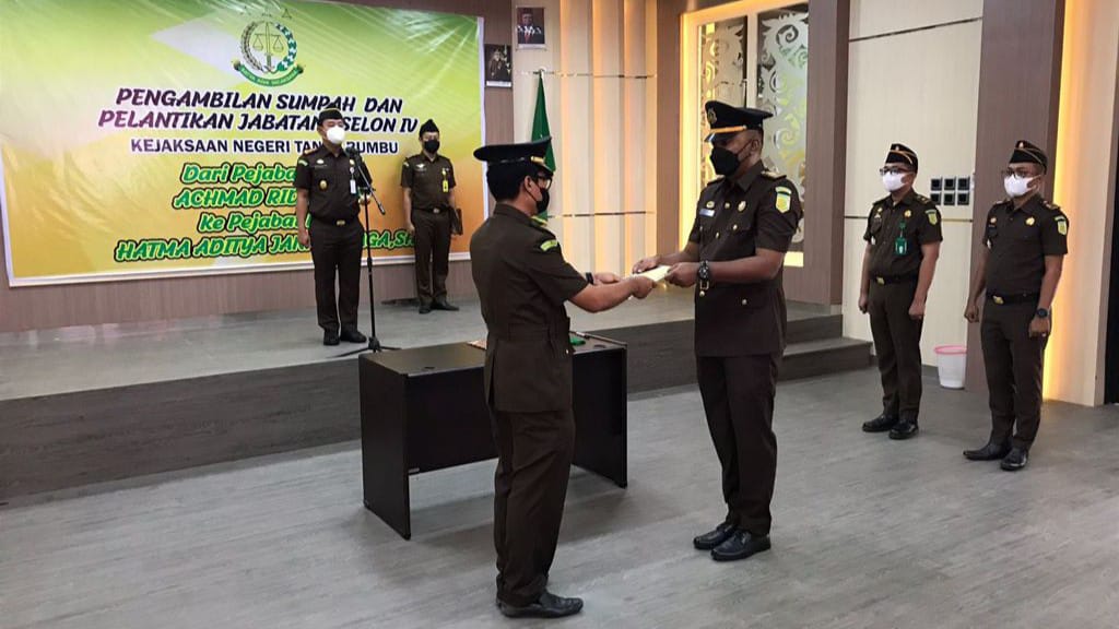 BATULICIN,headline9.com – Kajari Tanah Bumbu M Hamdan Saragih, SH memimpin langsung upacara serah terima jabatan (sertijab) Kepala Seksi Perdata dan Tata Usaha Negara (Datun) yang bertempat di Aula Adhiyaksa Kejaksaan Negeri Tanah Bumbu, Senin 20/09/21.
