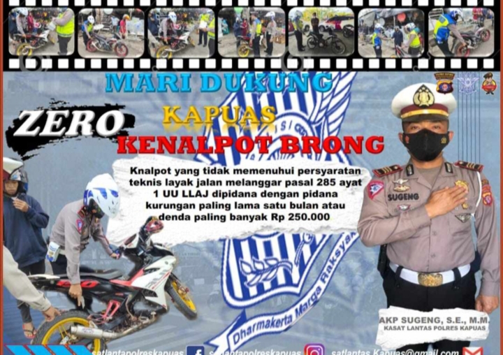 Kapolres Kapuas AKBP Manang Soebeti melalui Kasat Lantas Polres Kapuas, AKP Sugeng, SE. MM menegaskan, seluruh jajarannya akan memberi tindakan tegas terhadap kendaraan yang menggunakan knalpot brong atau knalpot bersuara bising.
