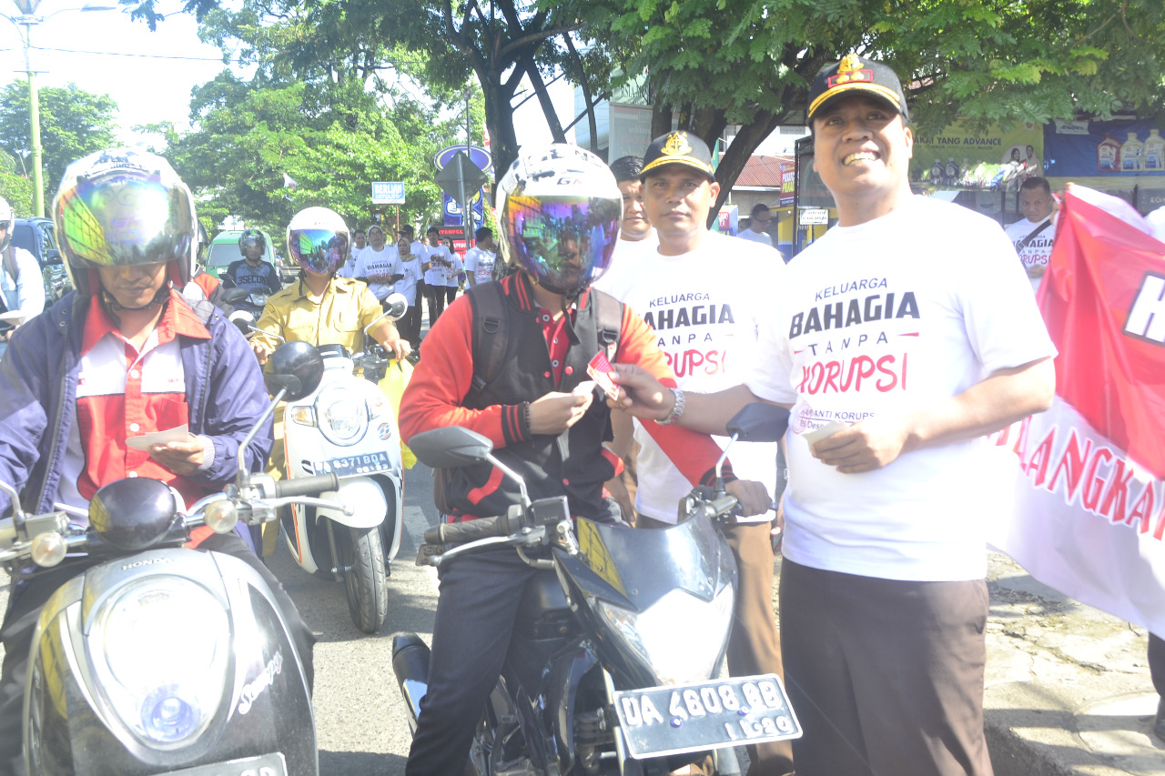 Dipimpin langsung oleh Kajari Kabupaten Banjar Muji Martopo pembagian stiker mengangkat tema “Melangkah Pasti, Cegah dan Berantas Korupsi” dan langsung menempelkan di kendaraan roda 4 dan 2