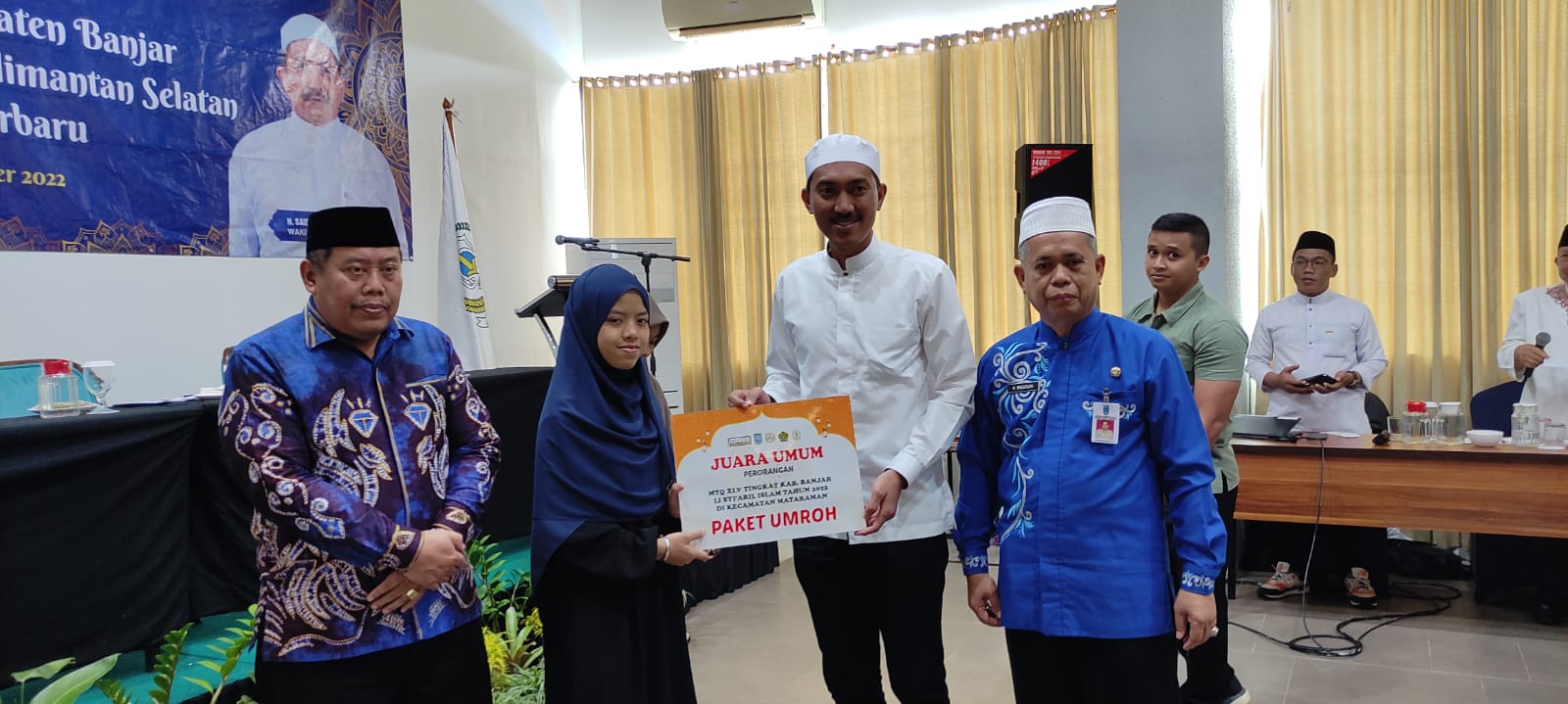 Dalam kesempatan ini Bupati Banjar H Saidi Mansyur, didampingi Kepala Kemenag Banjar H Najwan Noor dan Ketua LPTQ Banjar H Masruri juga menyerahkan bonus paket umrah kepada juara umum perorangan dan juara favorit MTQ XIV Tingkat Kabupaten Banjar Li Syi’aril Islam tahun 2022 di Kecamatan Matraman.