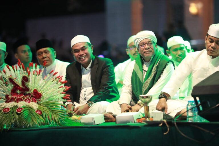 Tampak ribuan warga bersholawat dan memanjatkan doa dalam rangkaian acara Tanah Bumbu Bersholawat bersama Habib Syech.