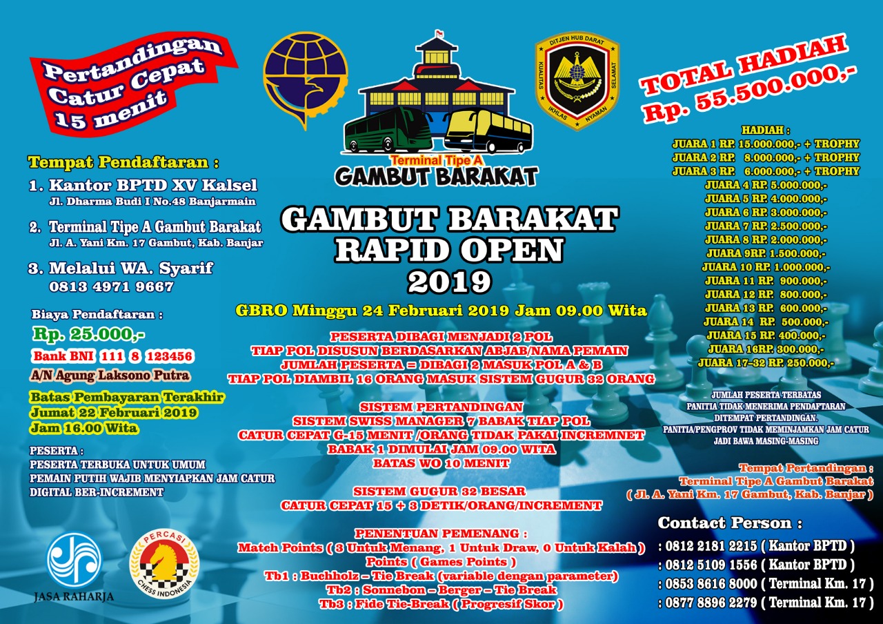 HEADLINE9.COM, MARTAPURA – Dalam rangka rangkaian peringatan  Pekan Keselamatan  Jalan Nasional tahun 2019, Balai Transportasi Darat wilayah XV Provinsi Kalimantan Selatan menggelar pertandingan catur. Kegiatan bertajuk Gambut Barakat Rapid Open 2019 dilaksanakan di Terminal Gambut Barakat, Minggu (24/02/2019) pukul 09.00 wita.