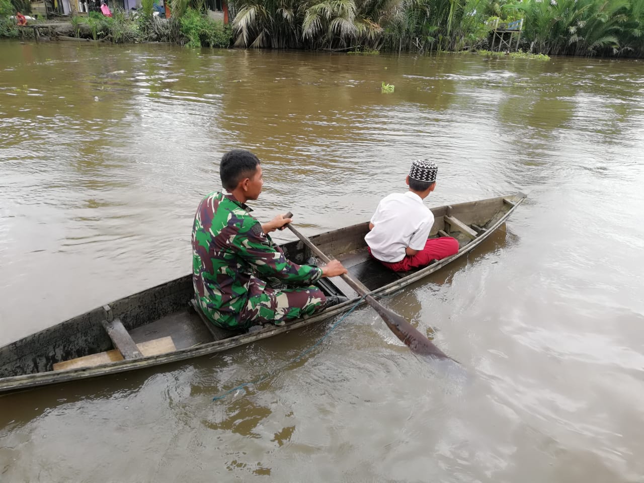 Serka Bahril di bantu dua orang rekan Babinsa terlihat sedang menyeberangkan anak-anak. Mereka baru pulang sekolah dari SD Negeri Aluh- aluh Besar. Mengayuh perahu seperti pekerjaan rutin setiap tahun bila pergantian musim.