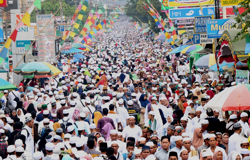 Sekumpul menjadi lautan manusia berbaju putih. Jalan beraspal ditutupi sejadah jemaah sejak pagi sampah malam hari.