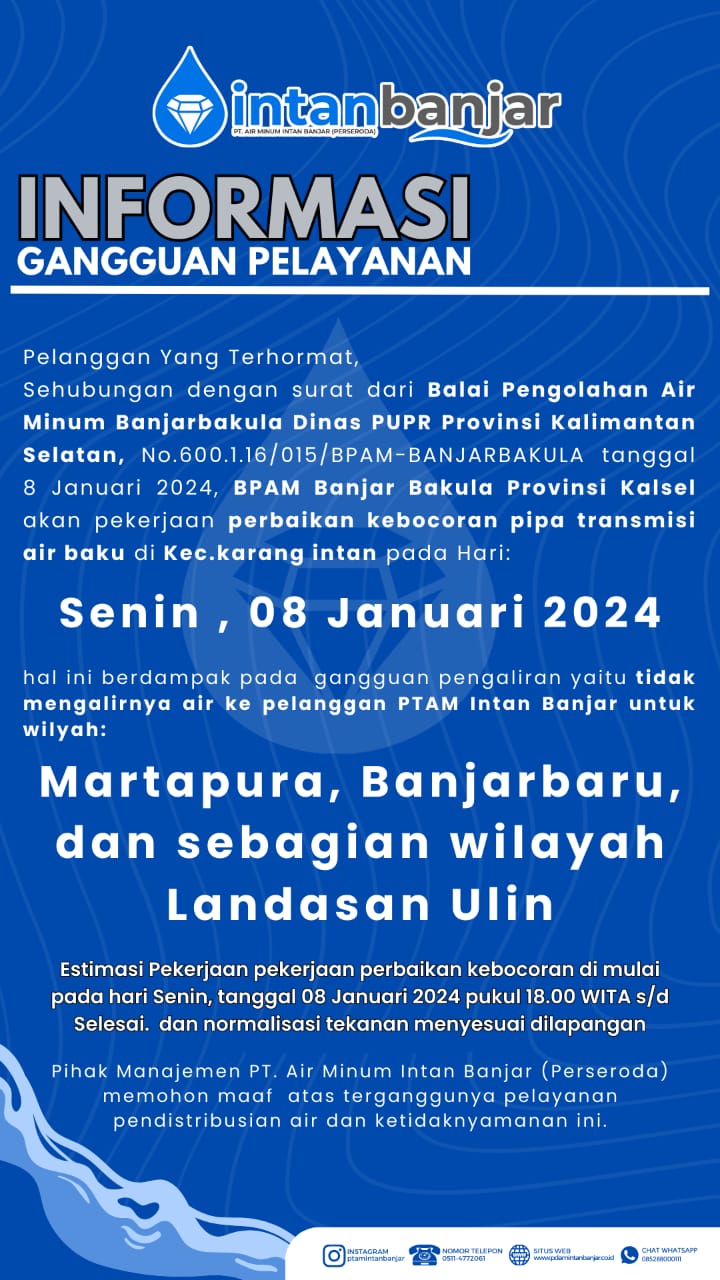 Sebagai dampak dari perbaikan, aliran air ke pelanggan di wilayah Banjarbaru, Martapura, dan Landasan Ulin terhenti. Perbaikan ini direncanakan dimulai pada Senin, 8 Januari 2024, pukul 18.00 Wita.