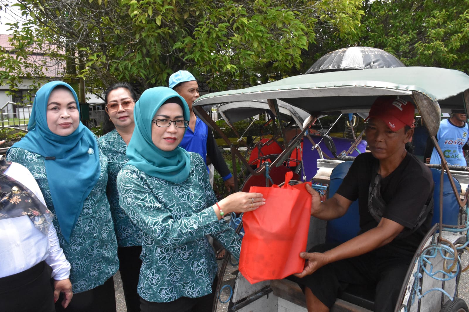 Ketua TP PKK Kabupaten Kapuas Agustina Erlin Hardi langsung terjun kelapangan untuk memberikan bantuan sembako kepada tukang becak yang ada di pinggiran jalan Kota Kapuas serta didampingi pengurus TP PKK Kabupaten Kapuas.