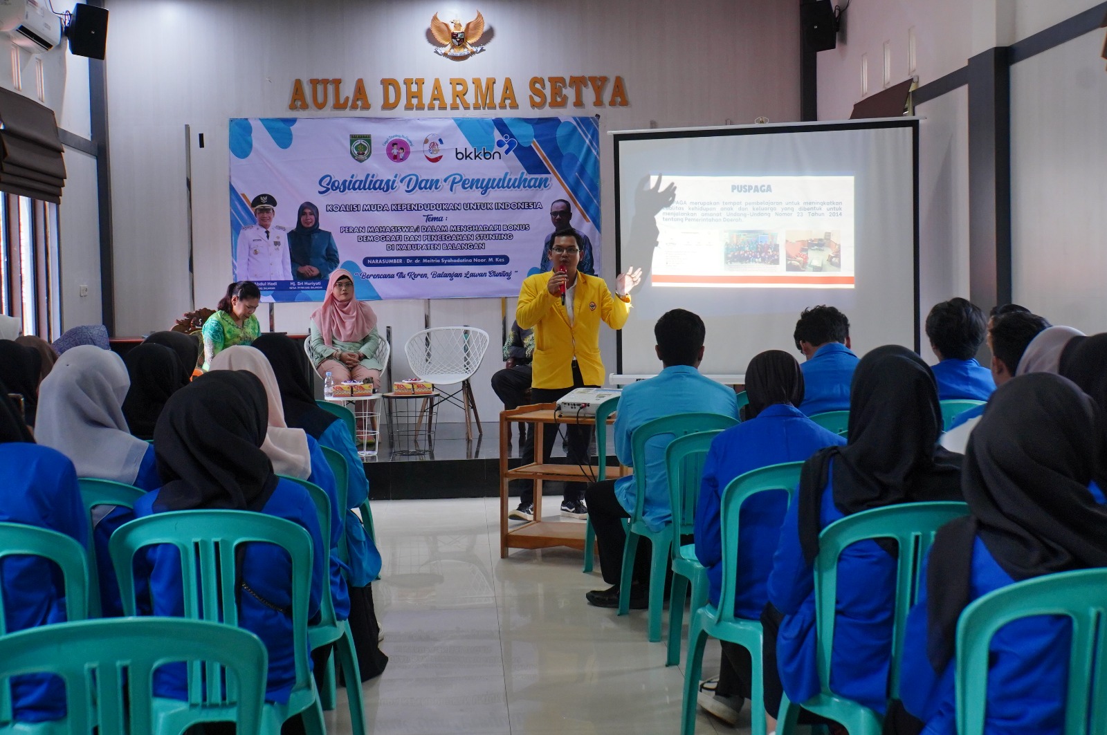 Adapun sosialisasi dan penyuluhan mengusung tema peran mahasiswa/i dalam menghadapi bonus demografi dan pencegahan stunting, serta sosialisasi Pusat Pembelajaran Keluarga (Puspaga) di Kabupaten Balangan.
