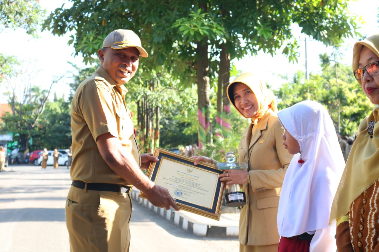 Seusai apel peringatan Hari Buku dan Hari Kearsipan Nasional, I Gusti Nyoman Yudiana menyerahkan hadiah kepada pemenang Lomba Bercerita tingkat Provinsi Kalsel dan pemenang lomba perpustakaan desa tingkat Kabupaten Banjar.