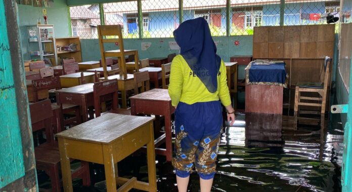 “Banjir di sekolah ini sudah hampir sepekan. Kalau siswa kita sudah tiga hari belajar di rumah secara daring. Hari sebelumnya tidak begitu, hari ini memang airnya naik,” ungkapnya.