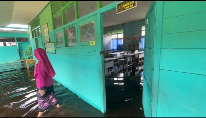 Headline9.com, MARTAPURA – SD Negeri Gambut 7, yang terletak di Jalan Ahmad Yani, Kilometer 14,5, Gang Antasari, Gambut, Kabupaten Banjar, terpaksa melakukan proses belajar mengajar secara jarak jauh (online) untuk sementara. Lantaran kondisi ruang kelasnya kini sudah terendam banjir.