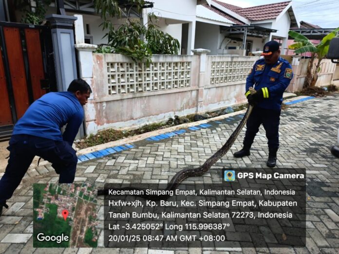 Headline9.com BATULICIN – Petugas Damkar Posko Simpang Empat Kabupaten Tanah Bumbu berhasil melakukan evakuasi penanganan ular sawa/sanca.