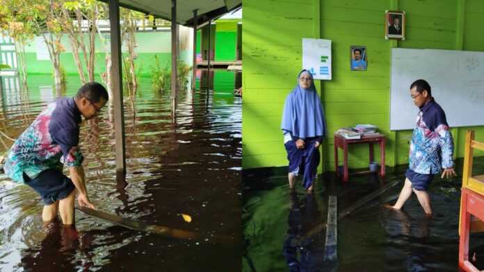 “Saya di sini akhir 2021, pelaksanaan rehabilitasi terakhir dilaksanakan di 2023 yakni peninggian lantai ruang kelas, setelah itu tidak ada lagi. Sementara ini ada empat kelas yang terendam banjir cukup dalam di antaranya ruang kelas 1A, 1B, kelas 2, dan kelas 3A, kondisi teras sekolah juga sudah tenggelam saat Jumat (17/1/2025) kemarin makanya kita terapkan sementara PJJ dan jika volume air sudah mulai surut baru bisa kita laksanakan Pembelajaran Tatap Muka (PTM). Untuk ruang guru dan perpustakaan masih aman karena posisinya lantai lebih tinggi dari ruang kelas,” ungkapnya, kepada media ini, Kamis (23/1/2025).