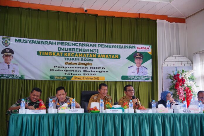 Headline9.com, BALANGAN – Pemerintah Kecamatan Awayan menggelar Musyawarah Perencanaan Pembangunan (Musrenbang) dalam rangka penyusunan Rencana Kerja Pemerintah Daerah (RKPD) Kabupaten Balangan tahun 2026, di Aula Temenggung Jalil Kecamatan Awayan, Selasa (4/2/2025).