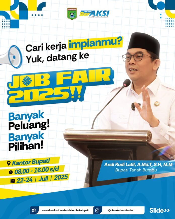Headline9.com, BATULICIN – Pemerintah Kabupaten Tanah Bumbu kembali menunjukkan komitmennya terhadap peningkatan kesejahteraan masyarakat melalui pelaksanaan Job Fair 2025 yang digelar selama tiga hari, 22–24 Juli 2025, bertempat di Halaman Kantor Bupati Tanah Bumbu, mulai pukul 08.00 hingga 16.00 WITA.