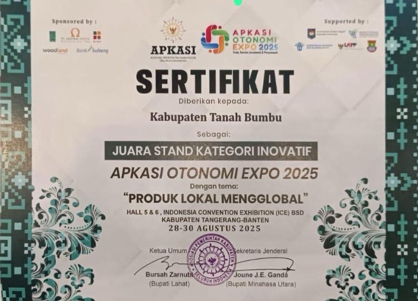 Headline9.com, BATULICIN – Kabupaten Tanah Bumbu menerima penghargaan Stand Kategori Inovatif pada gelaran Apkasi Otonomi Expo (AOE) 2025, 28-30 Agustus 2025 di Indonesia Convention Exhibition (ICE) BSD, Tangerang.