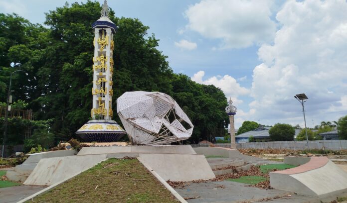 Headline9.com, MARTAPURA – Ikon Intan Martapura (eks air mancur) alias Taman Pojok Baca di kawasan Ruang Terbuka Hijau (RTH) Cahaya Bumi Selamat (CBS) Martapura, rusak. Fasilitas yang memiliki diameter terluar (outside diameter) berkisar 19,30 meter, bergeser dan patah.