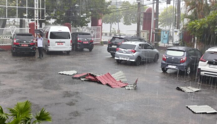Headline9.com, MARTAPURA – Kantor DPRD Kabupaten Banjar diterjang hujan lebat disertai angin kencang, Rabu (1/10/2025). Puluhan keping multi roof genteng metal terbang, dan menghantam sejumlah mobil milik anggota legislatif setempat.