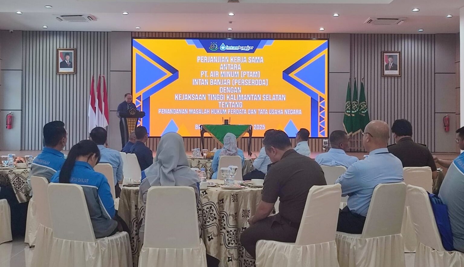 Headline9.com, BANJARBARU – PT Air Minum (PTAM) Intan Banjar (Perseroda) resmi menjalin kerja sama dengan Kejaksaan Tinggi (Kejati) Kalimantan Selatan berkaitan bidang penanganan masalah hukum perdata dan tata usaha negara (Datun). Penandatanganan perjanjian kerja sama tersebut digelar, di Aula ST Burhanuddin Kejati Kalsel, pada Selasa (14/10/2025).