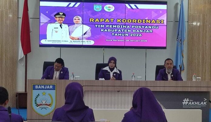 Headline9.com, MARTAPURA – Tim Pembina Pos Pelayanan Terpadu (TP Posyandu) Kabupaten Banjar menggelar Rapat Koordinasi (Rakor) di Aula Barakat, Martapura, Rabu (28/1/2026) pagi. Kegiatan ini bertujuan menyamakan langkah kinerja dan target program yang berfokus pada pemenuhan kebutuhan dasar masyarakat di seluruh kelompok usia. Rakor dibuka langsung Ketua TP Posyandu Kabupaten Banjar, Hj Nurgita Tiyas.