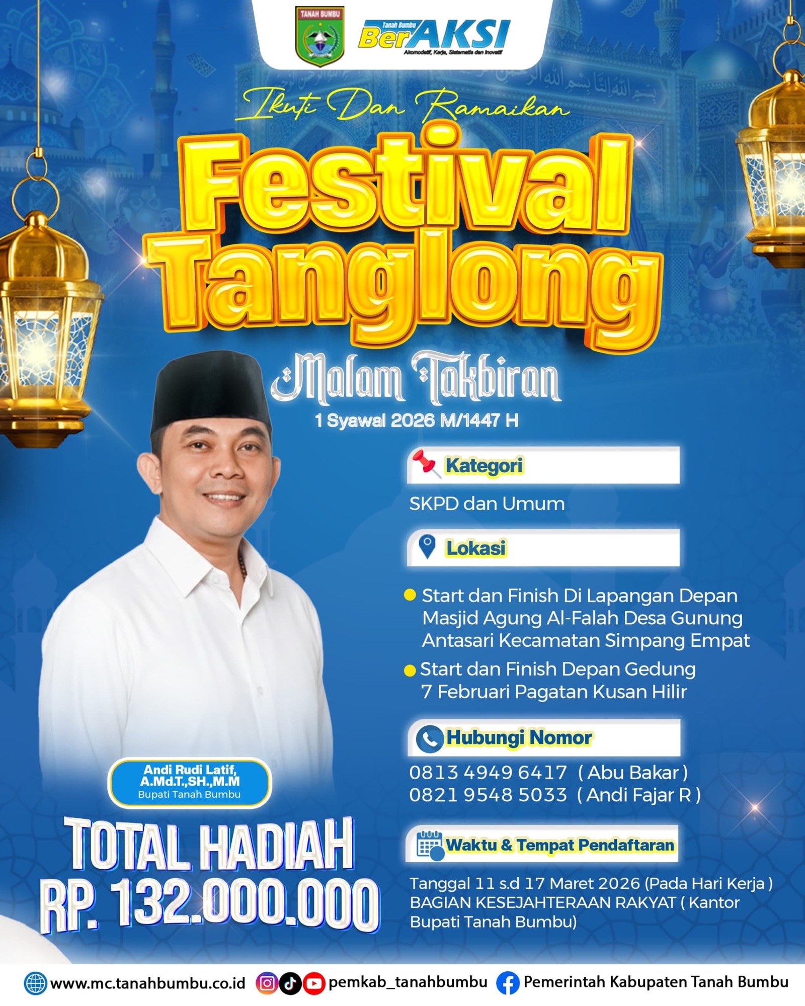 Headline9.com, Batulicin – Pemerintah Kabupaten Tanah Bumbu akan menggelar Festival Tanglong untuk memeriahkan malam takbiran Idulfitri 1447 Hijriah atau 1 Syawal 2026. Kegiatan tersebut terbuka bagi peserta dari kategori Satuan Kerja Perangkat Daerah (SKPD) maupun masyarakat umum dengan total hadiah mencapai Rp132 juta.