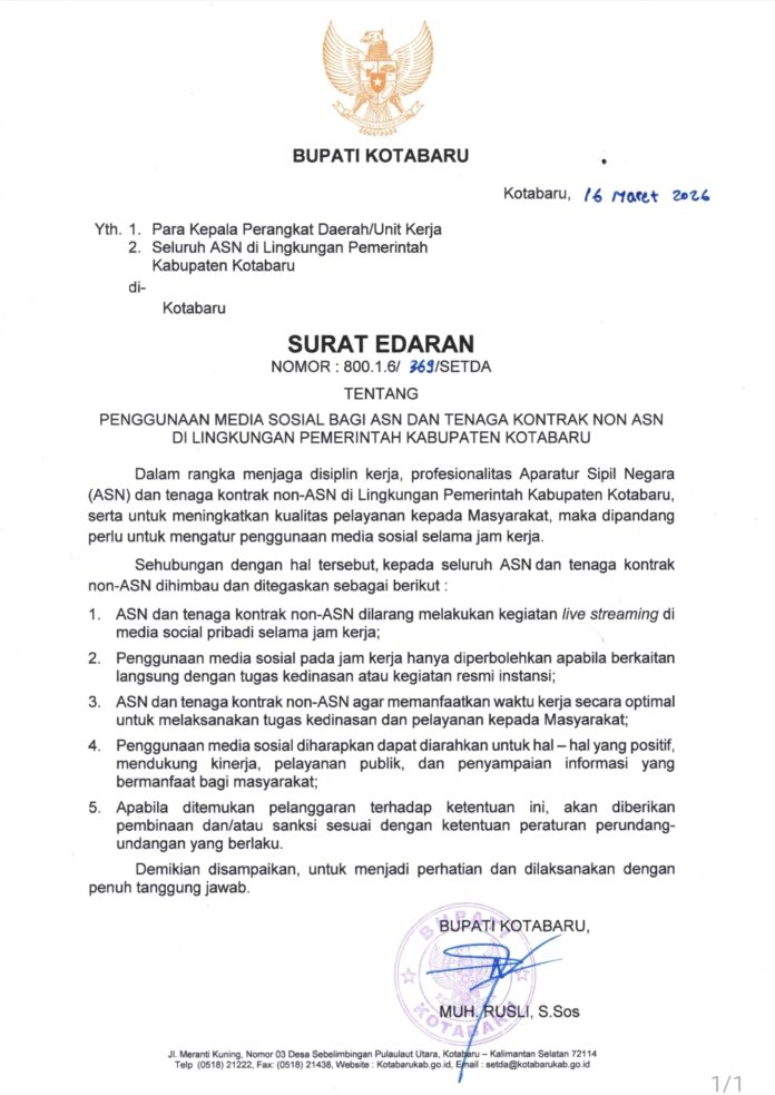headline9.com, KOTABARU – Pemerintah Kabupaten Kotabaru menerbitkan Surat Edaran Nomor 800.1.6/369/SETDA tentang penggunaan media sosial bagi aparatur sipil negara (ASN) dan tenaga kontrak non-ASN di lingkungan pemerintah daerah.