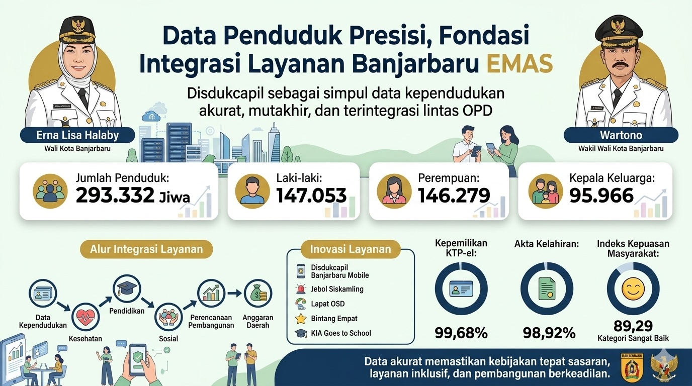 Berdasarkan Data Kependudukan Bersih Semester II Tahun 2026, jumlah penduduk Kota Banjarbaru tercatat sebanyak 293.332 jiwa, terdiri dari 147.053 laki-laki dan 146.279 perempuan, dengan total 95.966 kepala keluarga. Data ini menjadi rujukan utama dalam penyusunan berbagai kebijakan strategis daerah, termasuk penentuan kebutuhan layanan dasar, alokasi anggaran, hingga penetapan sasaran program.