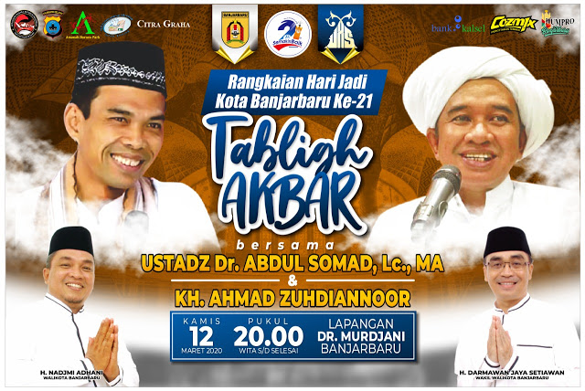 HEADLINE9.BANJARBARU – Lapangan Dr Murdjani Banjarbaru, Kalimantan Selatan pada Kamis (12/3/2020) malam, diprediksi akan membludak orang. Karena di hari itu, akan digelar tablig akbar. Ustaz Abdul Somad, kondang dipanggil UAS didaulat sebagai penyampai tausiah. Tak sendiri, UAS direncanakan akan tandem dengan KH Ahmad Zuhdianoor, kerap disapa Guru Zuhdi.